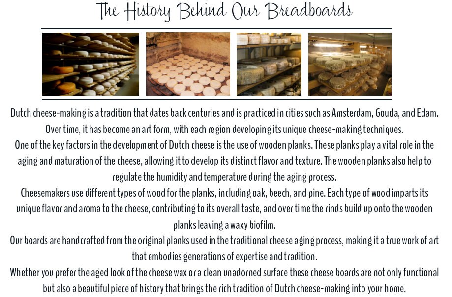 Boards were handcrafted, giving each one its character. These were created using reclaimed cheese board wood planks from Holland that were used to dry and age cheese.